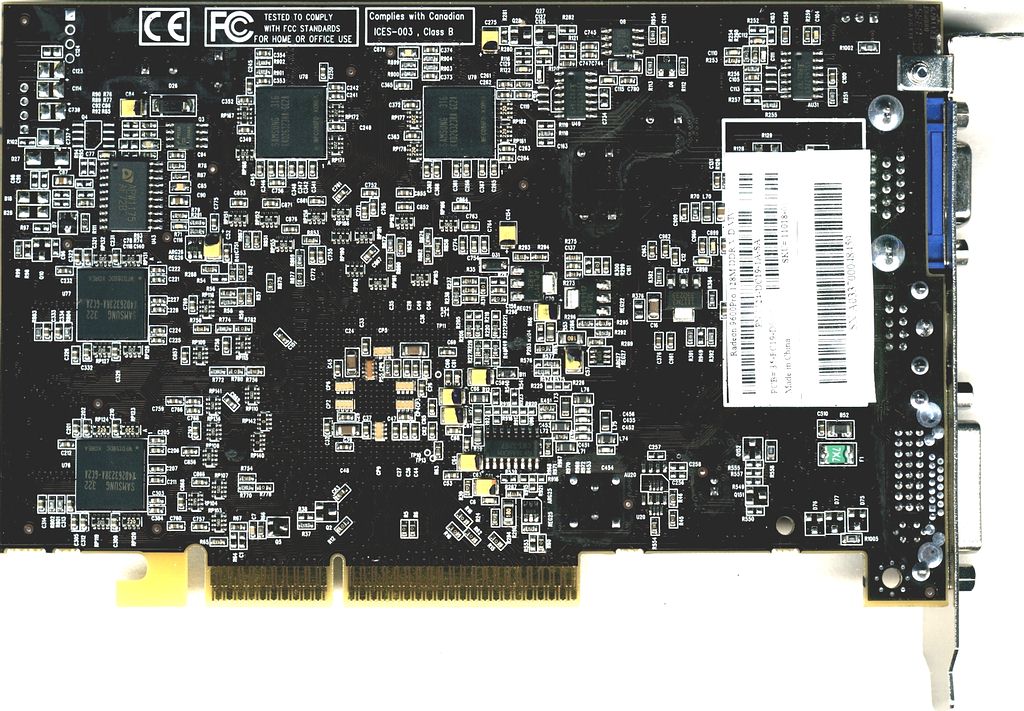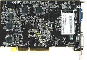 | Интерфейс AGP x8/x4/x2, 128 МБ памяти DDR SDRAM, размещенной в 8 микросхемах на лицевой и оборотной сторонах PCB. Микросхемы памяти производства Samsung (BGA). Время выборки у микросхем памяти 2,8ns, что соответствует частоте работы примерно 350 (700) МГц, память работает на частоте 300 (600) МГц. Частота работы GPU — 400 МГц, шина обмена с памятью 128 бит. | ![]() |