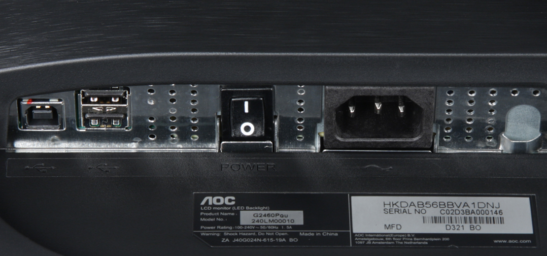 Монитор оснащен четырьмя входами: DisplayPort, HDMI, DVI-D и VGA. Есть режим с автоматическим поиском активного входа. Ручной выбор входа осуществляется кнопкой на рамке или в меню. Входы HDMI и DisplayPort способны принимать цифровые аудиосигналы (только PCM стерео), которые выводятся после преобразования в аналоговый вид на встроенные громкоговорители и через гнездо миниджек 3,5 мм. К этому гнезду можно подключить внешнюю активную акустическую систему или наушники. При работе от других видеовходов звук в аналоговом виде можно завести через второй разъем миниджек 3,5 мм. Встроенные громкоговорители звучат согласно их размерам и акустическому окружению — негромко, без низких частот вообще, с заметными паразитными резонансами на некоторых частотах и с перегрузками на высоком уровне сигнанла. Мощности выхода на наушники хватило, чтобы в 32-омных наушниках громкость была достаточной, и даже с небольшим запасом. Качество звука в наушниках в принципе неплохое — звук чистый, воспроизводятся все частоты, в паузах шума не слышно. Один из двух USB-портов на рамке имеет красную вставку и значок молнии рядом, что означает повышенную нагрузочную способность. Его можно использовать, например, для ускоренной зарядки мобильных устройств, если, конечно, устройство сможет распознать возможность увеличения тока зарядки.