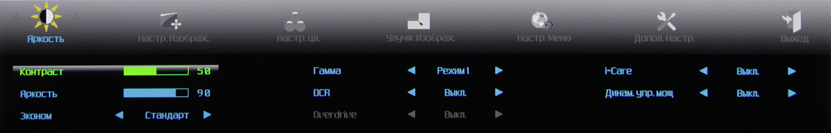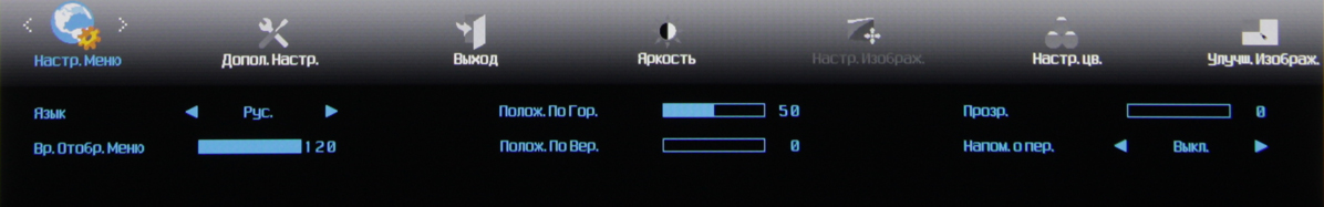а при долгом нажатии запускает автоматическую подстройку под параметры VGA-сигнала, вторая — переключает режимы Эконом, третья отвечает за регулировку громкости, четвертая — выводит меню установок. Меню представляет собой широкую полосу со значками страниц в верхней части и с настройками в нижней. Навигация по меню не самая удобная, но привыкнуть можно. При настройке изображения меню остается на экране, что немного мешает оценке вносимых изменений. Можно передвинуть меню, отрегулировать прозрачность его фона и установить тайм-аут автоматического выхода из меню. Есть русская версия экранного меню.