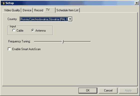 Раздел TV содержит выбор региона, диапазона (антенный/кабельный) и функцию точной подстройки канала. Опция Enable Smart Autoscan, по всей видимости, отвечает за поиск по частоте.
