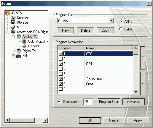 Настройки программы имеют древовидную структуру. Оригинально. В некоторых моментах наблюдается очевидный шаг назад. Так, например, каналы разделены на антенный и кабельный диапазоны.