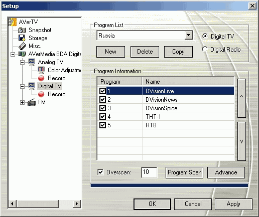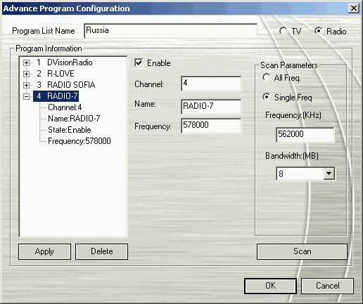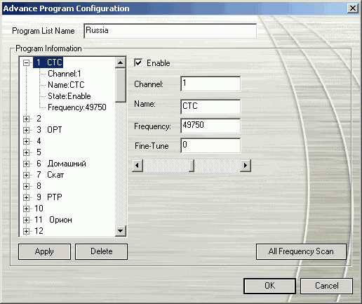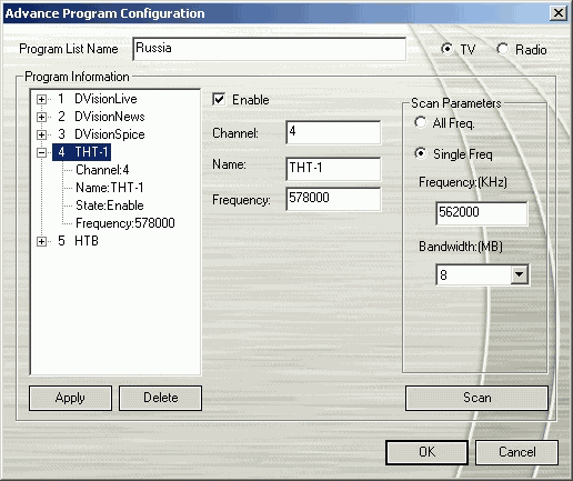 Интересно, что дополнительные настройки сканирования Advanced Settings становятся доступны только после окончания поиска. К сожалению, ручная настройка таких параметров как VPID (Video Program Identification) и APID (Audio Program Identification) невозможна. С другой стороны, в нашем случае такой необходимости не возникло, с приёмом цифровых каналов тюнер справился успешно.