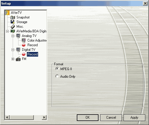 В режиме DVB-T возможна запись как программного MPEG2-потока, так и звуковой дорожки отдельно. Разделение на программный (Program Stream) и транспортный (Transport Stream) поток, содержащий дополнительную сервисную информацию, отсутствует.