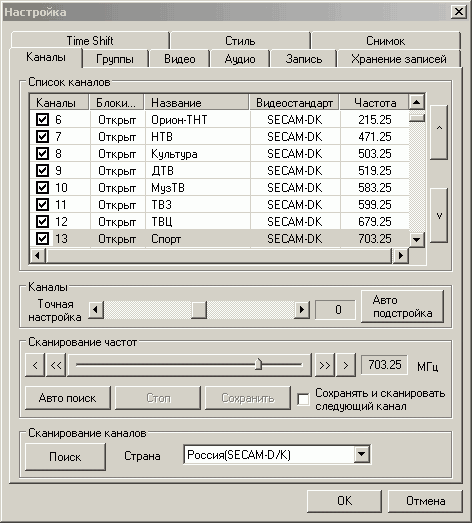 При настройке каналов используется полный список частот без разделения на антенный и кабельный диапазон. При наличии у пользователя каналов с разными системами цветности используется автоопределение стандарта, возможность принудительной настройки отсутствует.