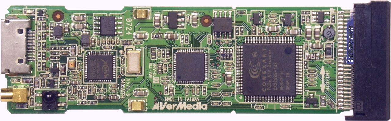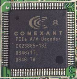 Аналогово-цифровое преобразование осуществляет 10-битный АЦП Conexant CX23885, знакомый нам по PCI-Express тюнерам на базе эталонного дизайна Sonora. Несмотря на возможность работы с компонентным сигналом, реализованной в некоторых моделях, у AVerTV Hybrid Express эта возможность отсутствует. Во всяком случае, штатный переходник из комплекта такого подключения не предусматривает, и выбора соответствующего варианта драйвер не предоставляет.