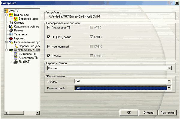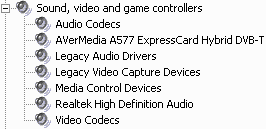 После установки в разделе Sound, video and game controllers появляется устройство AVerMedia A577 ExpressCard Hybrid DVB-T.