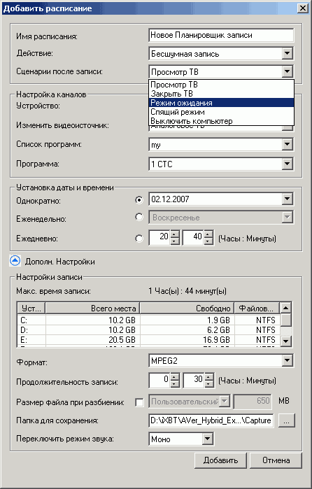Планировщик поддерживает фоновую запись Silent Record с отключенным звуком. Существует возможность отключения компьютера/перехода в энергосберегающий режим после выполнения запланированного задания. Добавился раздел дополнительных настроек, дублирующий, в частности, такие параметры, как место хранения записи, формат и разбиение файла.