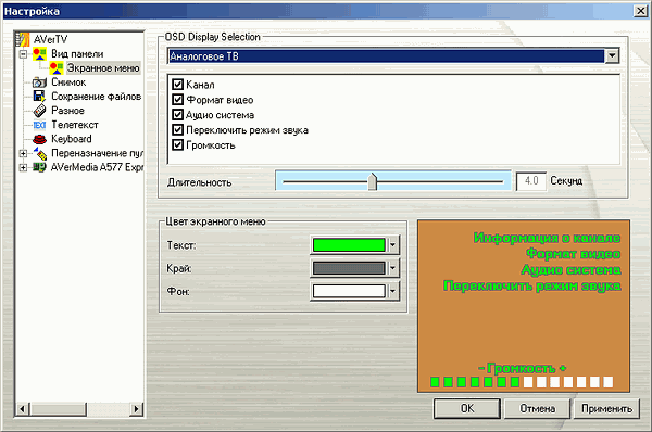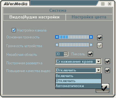Остальные настройки, изменяемые для каждого канала индивидуально, вызываются при помощи специальной кнопки на панели интерфейса. Таким образом, к стандарту цветности и режимам звука добавляются яркость, контраст, оттенок, насыщенность, резкость, масштабирование (overscan), тип деинтерлейсинга (Bob, Weave, краевое сглаживание) и названное в русском варианте Повышением качества видео шумоподавление (включено, выключено, автоматический выбор).