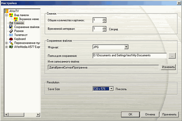 В настройках захвата кадров присутствуют количество, интервал между снимками, формат, префиксы (дата, время, сигнал, программа, пользовательский) и выбор разрешения. Максимальное количество скриншотов в серии составляет 100.