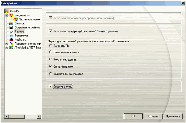 Раздел Разное содержит опцию включения/отключении аппаратного ускорения видео DxVA (почему-то недоступную уже долгое время на разных конфигурациях) и активацию поддержки энергосберегающих режимов с действиями, совершаемыми после отключения (закрыть приложение, завершить сеанс, режим ожидания, спящий режим). Чекбокс Свернуть окно помогает при работе в FM-режиме, позволяя минимизировать интерфейс до иконки в системном трее.