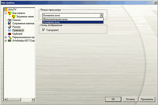 Настройки телетекста состоят из двух варианта вывода субтитров (в основном окне/в отдельном окне) и чекбокса, отвечающего за прозрачность.