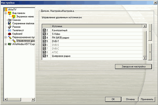 В подразделе Управление удалённым источником можно выбрать режимы работы тюнера при использовании пульта. Там же находится возврат к заводским настройкам.
