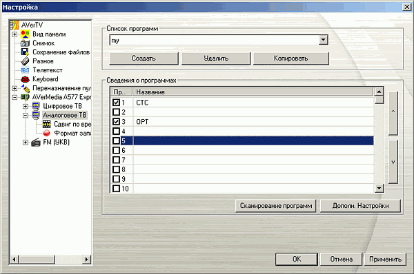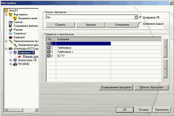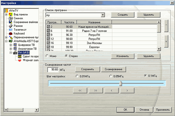 Несмотря на возможность DVB-T передавать на одной частоте как телевизионные каналы, так и радиостанции, подход AVerMedia предусматривает раздельное отображение теле- и радиоканалов как для аналогового, так и для цифрового режимов. При выборе России в качестве региона автопоиск работает корректно. Можно сохранить несколько пользовательских списков каналов.