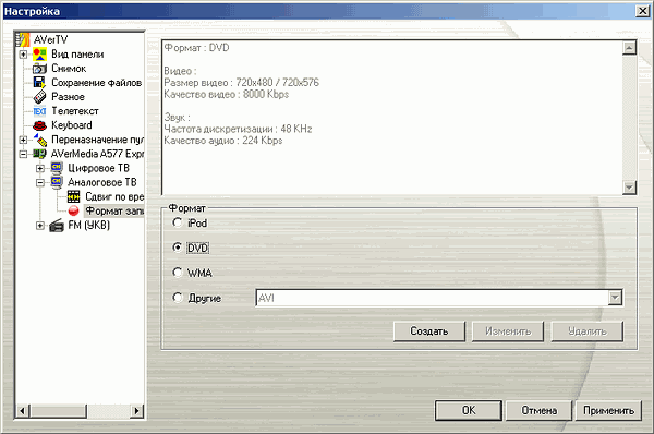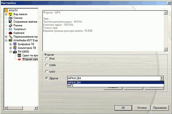 К нескольким стандартным профилям, представленным в разделе Формат записи можно добавлять пользовательские. Поддерживаются сторонние кодеки, установленные в системе.