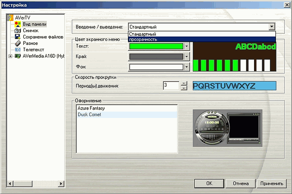 Как и прежде, в разделе Вид панели находятся такие настройки интерфейса, как общее оформление (варианты Azure Fantasy и Dusk Comet заметно отличаются друг от друга), цветовая гамма экранного меню (OSD) и эффект прозрачности при вызове главной панели.