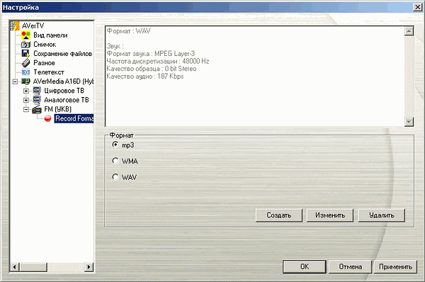 Как и в аналоговом TV-режиме, возможна запись с любым установленным в системе кодеком. Запись в mp3 ограничена системными параметрами 22 кГц 56 Кбит/с. Традиционно это ограничение обходится заменой стандартного кодека от Microsoft на полную версию Fraunhofer MPEG Layer-3 codec или использованием альтернативных вариантов.