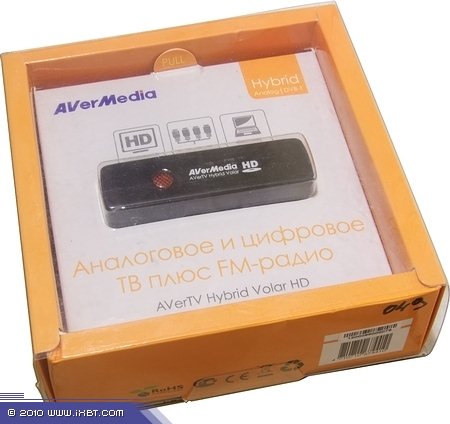 Компактная коробка AVerTV Hybrid Volar HD имеет не совсем обычный дизайн, представляя собой упакованный в пластиковую оболочку контейнер фирменного оранжевого цвета с прозрачной вставкой, демонстрирующей сам тюнер.