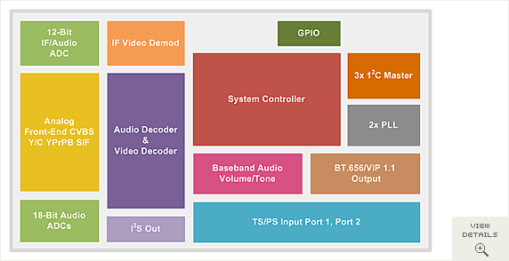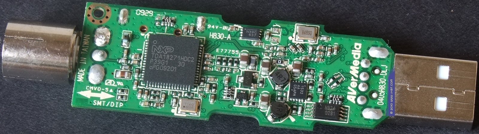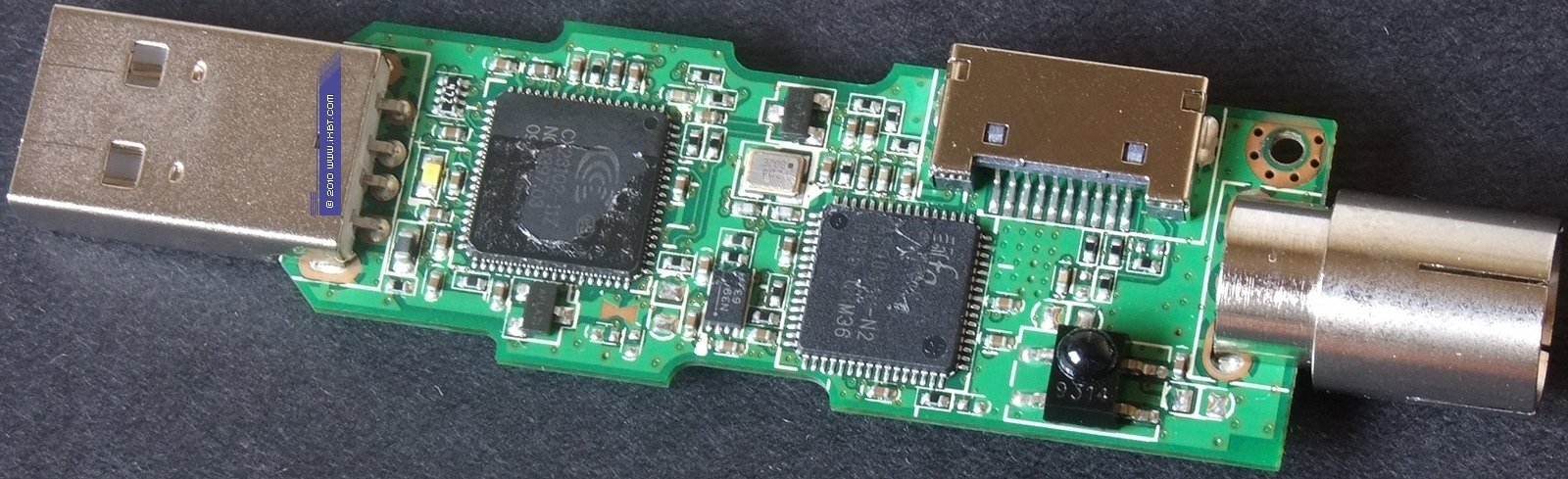 Приём сигнала осуществляется при помощи полупроводникового ВЧ-блока TDA18271HDС2 от NXP Semiconductors (бывшее подразделение Philips, сначала выделенное в самостоятельную компанию, а в феврале 2010 года приобретенное Trident Microsystems, Inc.). Обновился COFDM (Coded Orthogonal Frequency Division Multiplexing) демодулятора, AF9013-N1 производства ITE Tech. Inc. сменил AF9033B-N2 той же компании. Самым любопытным является декодер, тюнер оснащён до этого не встречавшимся нам CX23102-11Z от Conexant Systems, Inc., представляющим собой 10-разрядный декодер последнего поколения с поддержкой декодирования всех стандартов стереозвука и встроенными ИК- и USB-контроллерами.