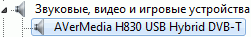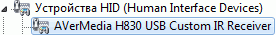 После установки в разделе Звуковые, видео и игровые устройства появляется устройство AVerMedia H830 USB Hybrid DVB-T, а в разделе Устройства HID (Human Interface Devices) устройство AVerMedia H830 USB Custom IR Reciever.