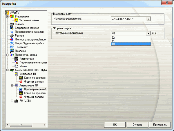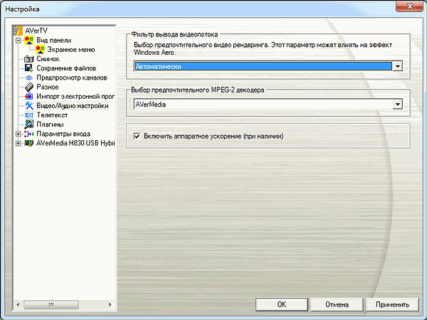 В разделе видео и аудионастроек доступны выбор видеорендерера (автоматически, Overlay Mixer, Video Mixing Renderer и Enhanced Video Renderer при доступности последнего в системе) и MPEG2-декодера (собственный декодер от AVerMedia или Microsoft DTV-DVD Video Decoder). В AVerTV 6.4 вернулась возможность включить аппаратное ускорение при его наличии.