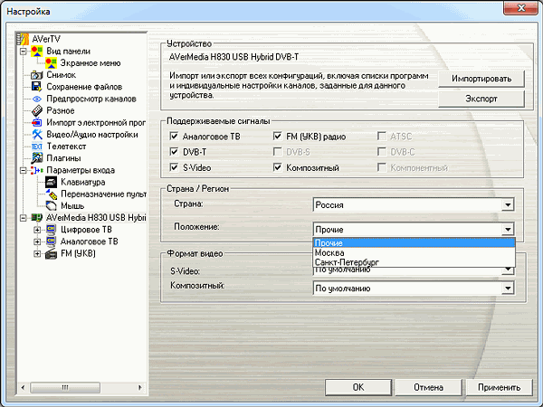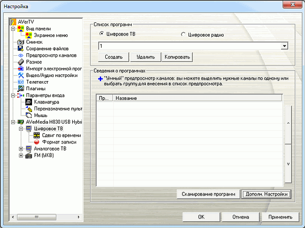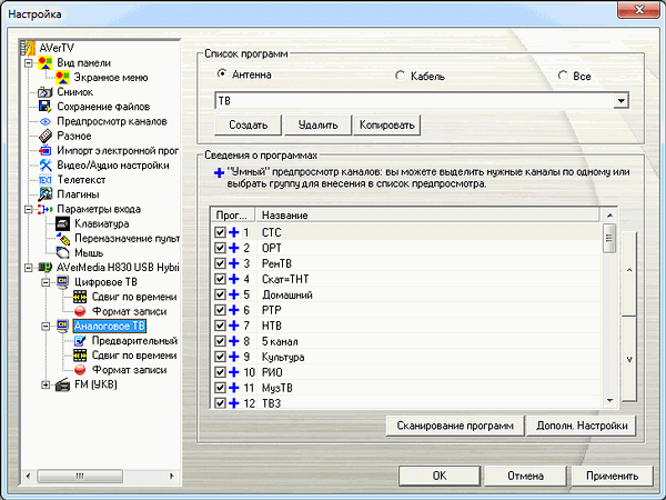 Несмотря на возможность DVB-T передавать на одной частоте как телевизионные каналы, так и радиостанции, подход AVerMedia предусматривает раздельное отображение теле- и радиоканалов как для аналогового, так и для цифрового режимов. При выборе России в качестве региона автопоиск работает корректно. Можно сохранить несколько пользовательских профилей.