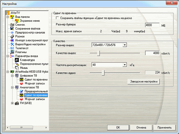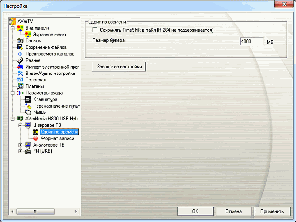 Режим отложенного просмотра TimeShift, в локализации от AVerMedia называющийся сдвигом по времени, поддерживает сохранение буферного файла в пределах заданного объёма (только для MPEG2, H.264 не поддерживается).