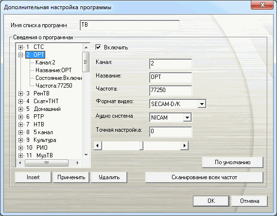 В дополнительных настройках каждого канала можно изменить название, частоту, полосу пропускания и настройки часового пояса для использования EPG (Electronic Program Guide). Там же можно провести поиск каналов на конкретной частоте.
