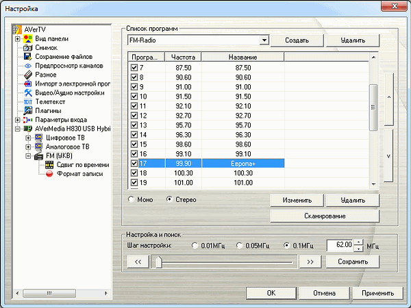 Программа использует общий интерфейс для всех режимов. В AVerTV 6.4 предусмотрены готовые списки радиостанций Москвы и Санкт-Петербурга, кроме того, цифровая панель имеет два режима работы — переключение каналов и ввод частоты.