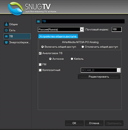 В разделе «ТВ» выбирается источник сигнала. Здесь же можно отключить общий доступ.