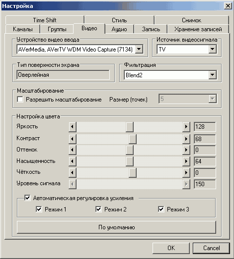 Перевод настроек несколько… хм… лаконичен. На самом деле, Режим 1, Режим 2 и Режим 3, как могут догадаться знакомые с неоднократно упоминаемой в наших обзорах программой Fly 2000 TV, есть не что иное, как White Peak Control, Color Peak Control и Long Pause AGC соответственно.