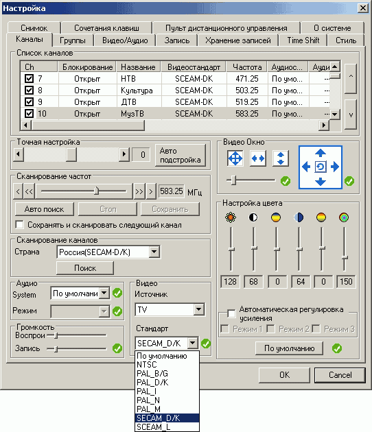 - Индивидуальная настройка стандарта цветности и параметров изображения для каждого канала