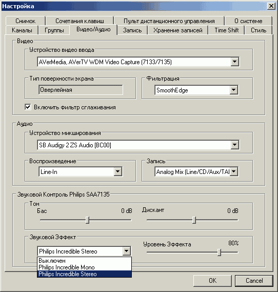Дополнительные аудиовозможности Philips SAA7135HL не имеют поканальной установки параметров. Режим Virtual Dolby Surround отсутствует, доступны только Philips Incredible Mono/Incredible Stereo (с регулировкой стереобазы), а также настройки тембра.