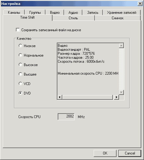 Настройки функция Time Shift позволяют варьировать разрешение при ее использовании в широких пределах. Вот только индикация соответствия частоты процессора используемым установкам подчас нуждается в корректировке, все-таки производительность Athlon 64 3000+ даже при его реальной тактовой частоте, является, мягко говоря, достаточной для MPEG-2 в разрешении 720×576.