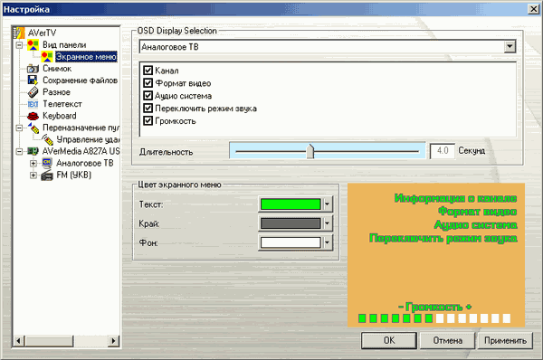 В разделе Вид панели находятся такие настройки интерфейса, как общее оформление (варианты Azure Fantasy и Dusk Comet заметно отличаются друг от друга), цветовая гамма экранного меню (OSD) и эффект прозрачности при вызове главной панели. Подраздел Экранное меню позволяет выбрать цветовую гамму, длительность и параметры для отображения (канал, систему цветности, режим звука и так далее).