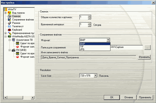 В настройках захвата кадров присутствуют (BMP, TIF, JPG), количество, интервал между снимками, формат, префиксы (дата, время, сигнал, программа, пользовательский) и выбор разрешения. Максимальное количество скриншотов в серии составляет 100.