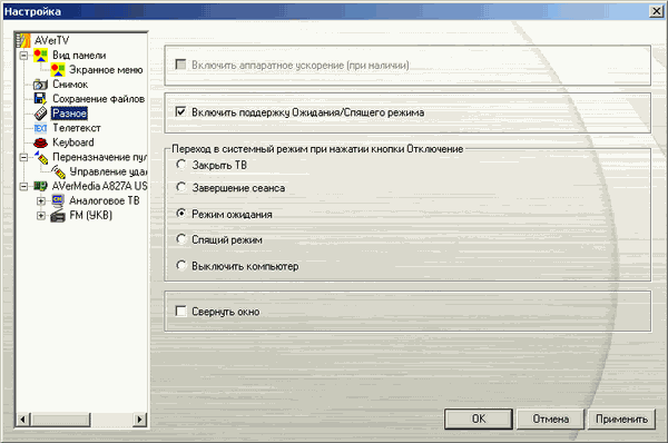 Раздел Разное содержит опцию включения/отключении аппаратного ускорения видео DxVA (недоступную уже долгое время на разных конфигурациях, несмотря на то, что требования к работе с HDTV на официальном сайте недвусмысленно указывают на её необходимость) и активацию поддержки энергосберегающих режимов с действиями, совершаемыми после отключения (закрыть приложение, завершить сеанс, режим ожидания, спящий режим). Чекбокс Свернуть окно помогает при работе в FM-режиме, позволяя минимизировать интерфейс до иконки в системном трее.