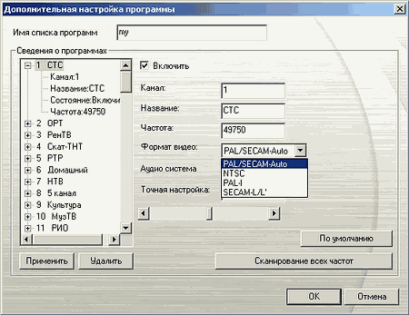 В дополнительных настройках можно найти не только название канала, частоту и индивидуальный стандарт цветности (как и для AVerTV Hybrid Express, жёсткой установки не предусмотрено, только автоматическое определение), но и поиск по частоте.