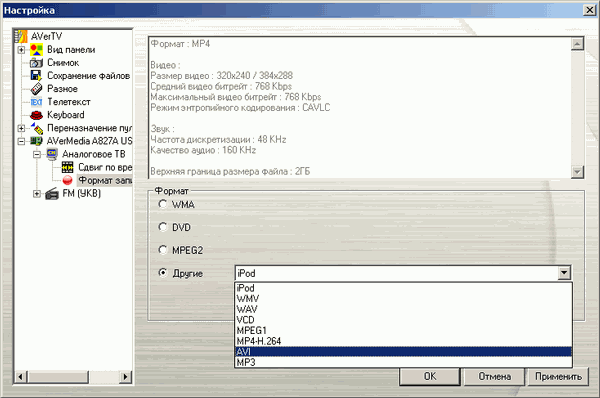 К нескольким стандартным профилям, представленным в разделе Формат записи можно добавлять пользовательские. Поддерживаются сторонние кодеки, установленные в системе, с настройкой дополнительных параметров.