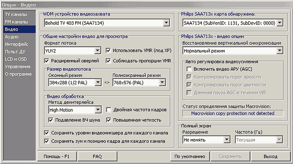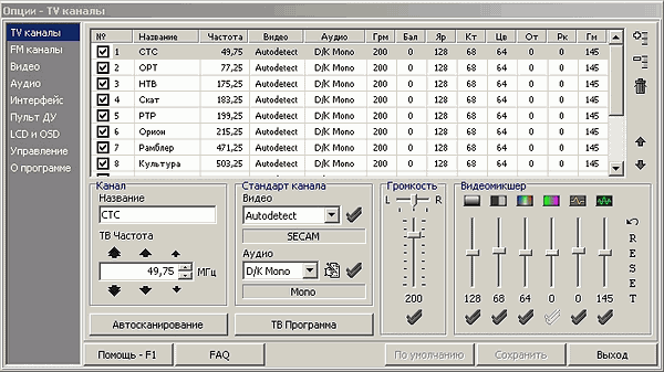 Из звуковых настроек следует отметить захват аудиосигнала при декодировании с промежуточной частоты тюнера и переход NICAM на первую несущую при ошибках CRC (при этом запрещается декодирование стереозвука, так что включение данной опции рекомендуется только в случае проблем с приемом стерео). Естественно, эти настройки доступны только для модели на SAA7134HL.