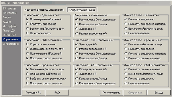 - Индивидуальные настройки яркости, контрастности, оттенка, насыщенности, четкости, уровня входного сигнала, аудио- и видеостандарта, громкости, аудиобаланса, размера и положения изображения в окне для каждого ТВ канала