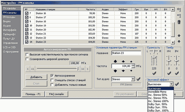 TEA5767 традиционно обеспечивает хорошее качество звука (скачать 20-секундный фрагмент, MP3, 192 Кбит/c). К тому же, не стоит забывать о возможностях SAA7135HL. Кстати, как и в TV-режиме, настройки дополнительной обработки звука доступны индивидуально для каждой радиостанции.