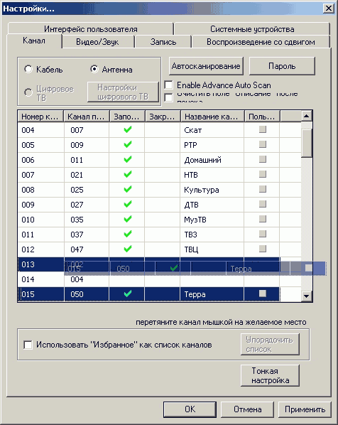Список каналов имеет возможность сортировки, реализованную с помощью перетаскивания каналов мышью с нажатой левой кнопкой.