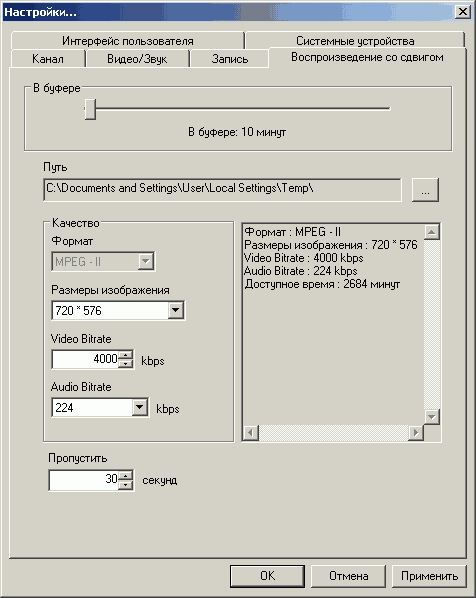 В настройках отложенного просмотра Timeshift доступны изменение максимального размера буферного файла, видео- и аудиобитрейт и интервал пропуска при перемотке. Запись осуществляется в MPEG2.