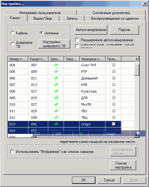 Эпопея с поиском по частоте (кнопка Расширенное автосканирование, шаг поиска 0.05, 0.1, 0.25, 0.5 и 1 МГц) продолжается. На этот раз программа зависала во время сканирования, так что, возможные изменения в работоспособности (напомним, что ранее результатом становилась маркировка всех каналов как найденных без возможности редактирования списка) обнаружить не удалось.