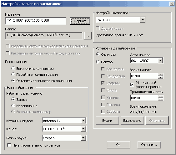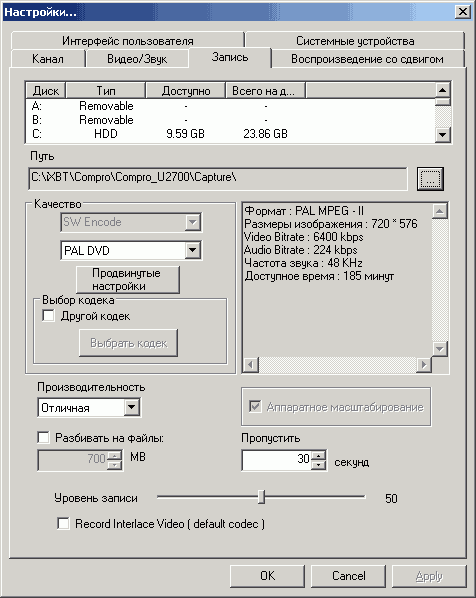 В цифровом режиме возможна запись в MPEG2 файл, запись транспортного потока и звуковой дорожки отдельно.