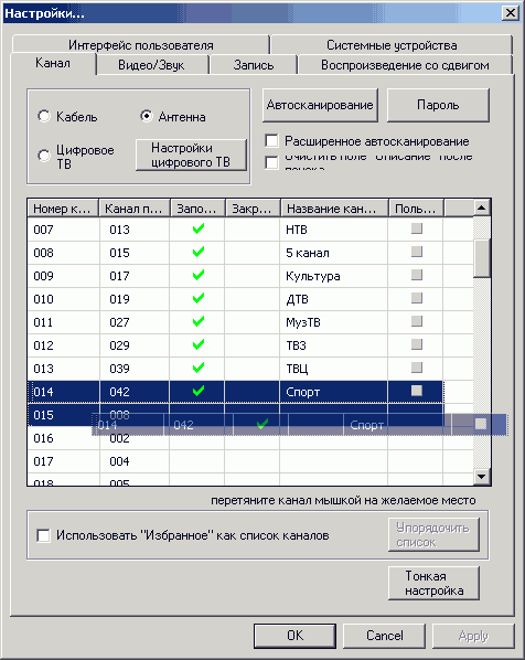 Сортировка каналов осуществляется перетаскиванием их мышкой с зажатой левой кнопкой.