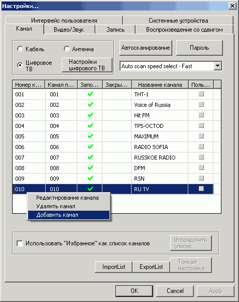 В наличии 7 фиксированных пользовательских списков избранных каналов без возможности редактирования их названий.
