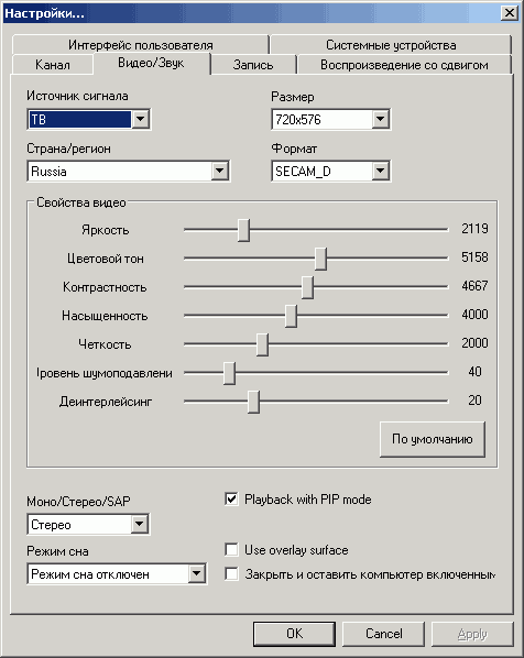 Общие настройки яркости, контраста, цветности, насыщенности, чёткости, деинтерлейсинга и программного шумопонижения, относительно которых изменяются индивидуальные, и бесполезный для U2700 выбор Моно/Стерео/SAP (также доступный в индивидуальных настройках) находятся в разделе Видео/Звук. Здесь же можно найти включение/отключение режима воспроизведения видефайлов в отдельном окне, включение/отключение оверлейной поверхности (при отключении используется Video Mixing Renderer) и таймер сна (до 2 часов с интервалом 30 минут).