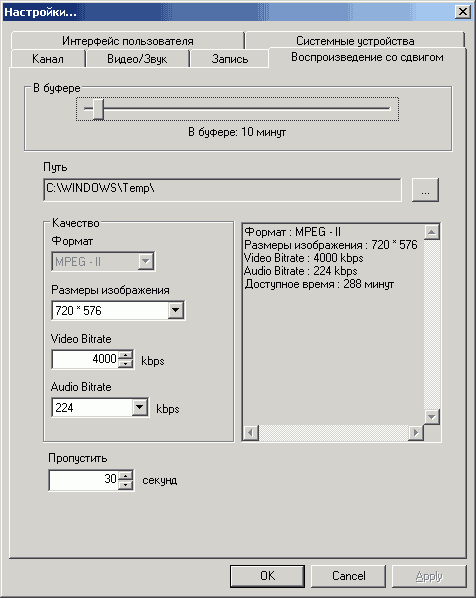 Настройки параметров отложенного просмотра Timeshift (в аналоговом режиме используется MPEG2, в цифровом параметры соответствуют параметрам принимаемого потока) допускают выбор разрешения, аудио- и видеобитрейта, максимальное время буфера, исходя из доступного места на жёстком диске, и интервал пропуска при перемотке.