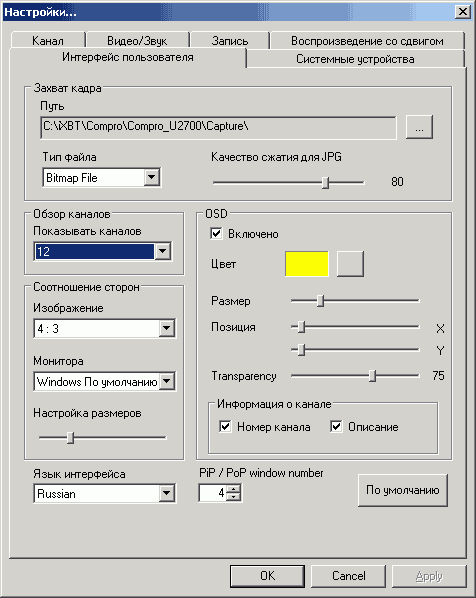 В разделе настроек пользовательского интерфейса можно изменить размер, цвет и расположение экранного меню, настроить масштабирование, выбрать формат захвата кадров (bmp и jpeg) и размер матрицы для режима предварительного многоканального просмотра (12 или 16 каналов). Реализовано несколько вариантов соотношения сторон изображения (4:3, 16:9, 16:10, пользовательское), также доступных в интерфейсной панели, и коррекция пропорций с учётом соотношения сторон монитора — (по умолчанию, 4:3, 5:4, 16:9, 5:3).